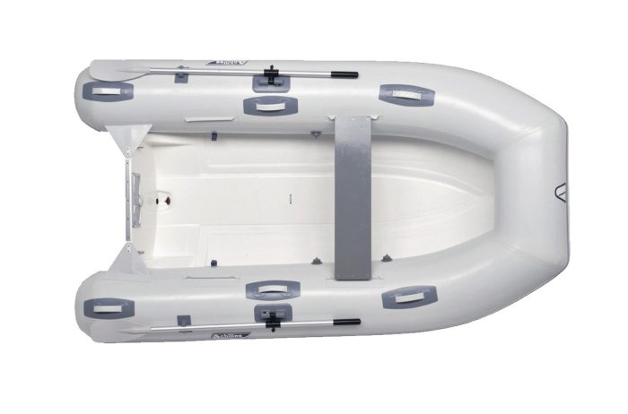 Achilles pearl grey hypalon reinforced fabric, deep “V” fiberglass hull, full length rub strake, removable wood seat, D-rings for towing bridle, stainless bow eye, lifting hardware for davits, grab handles, bow and stern carry handles, interior oar straps (except 240LX), fold down locking oar system, gas tank tie down hardware, protective transom plate, extra seat attachment patches (except 240LX), bailer valve, foot pump, and maintenance kit