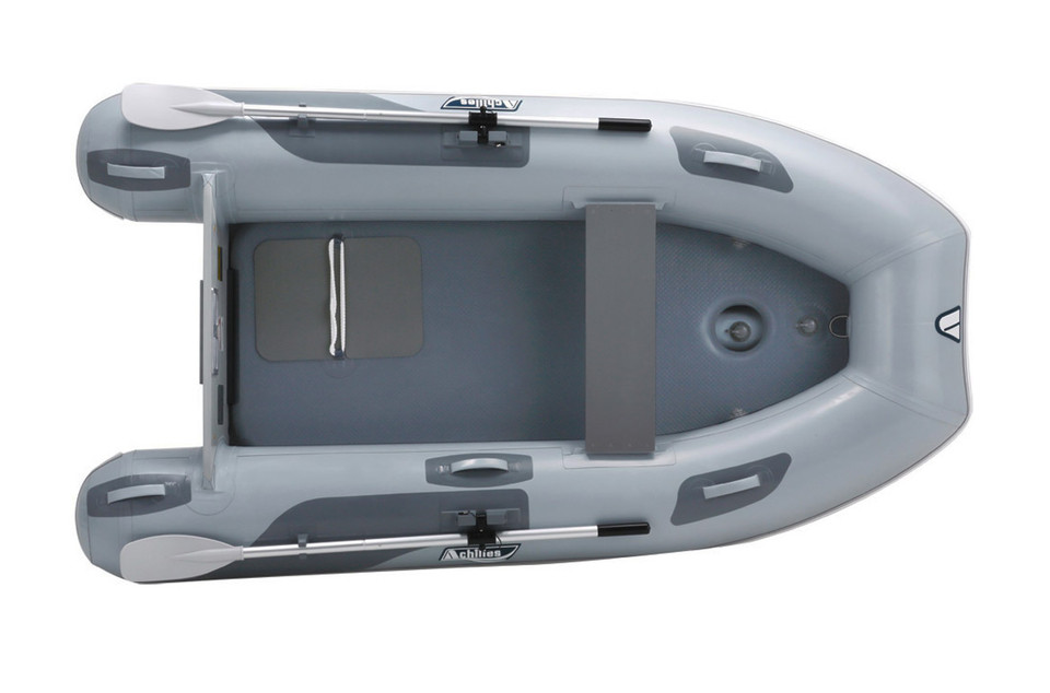Achilles LSI-260E inflatable boat is one of the popular sizes and is offered in both light grey and white hypalon fabric. The hypalon air deck is a unique trait and is able to be rolled up with the hull for convenient storage and travel. The boat should be able to plane with up to 2 passengers, but the tender can handle up to 3. Six horsepower is recommended, especially for pushing max load of up to 820 pounds.