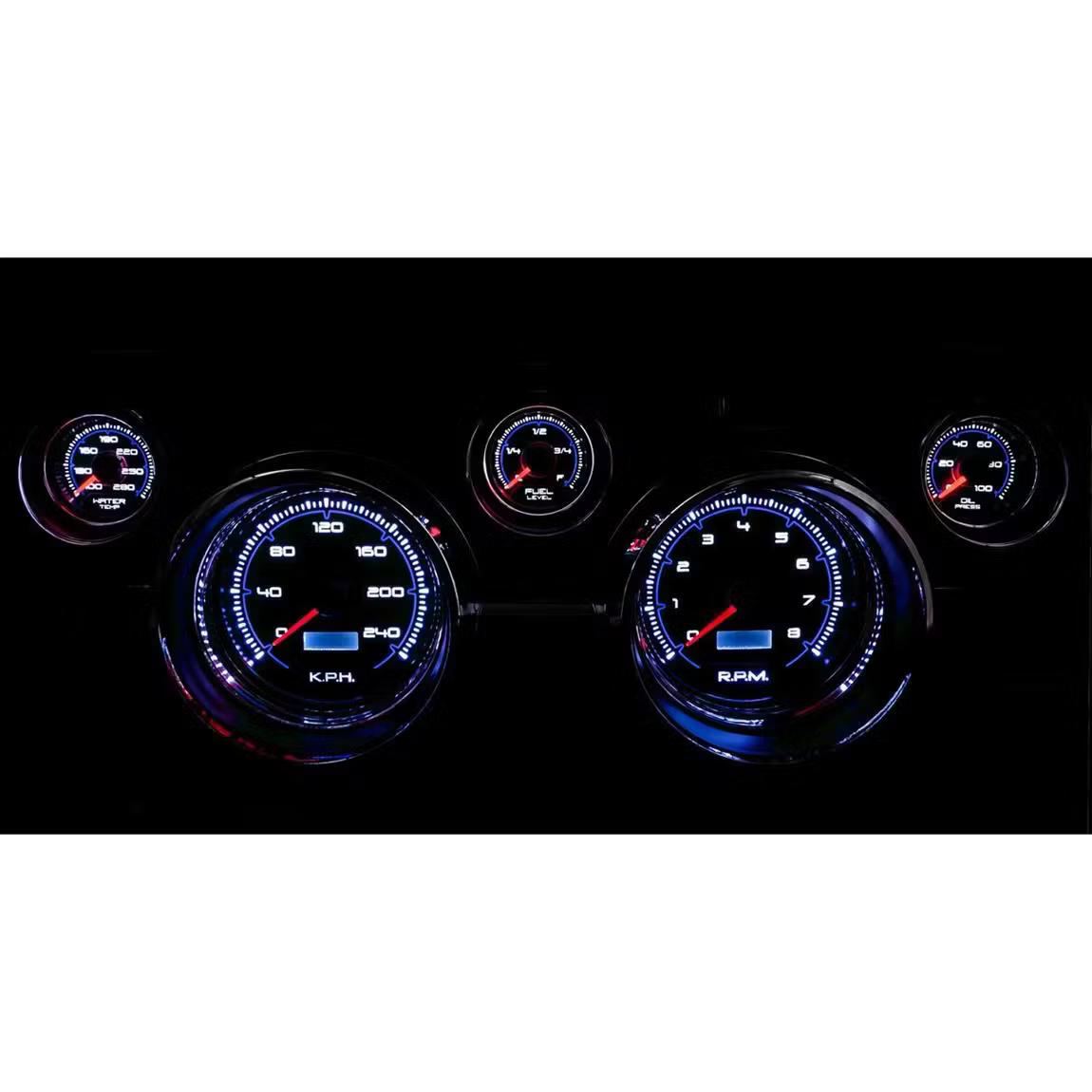 Includes 3-3/8″ Ultra Lite electric speedometer And tachometer and 2-1/16″ electric fuel level (73/10 ohm, non-linear), water temperature, oil pressure, and voltmeter