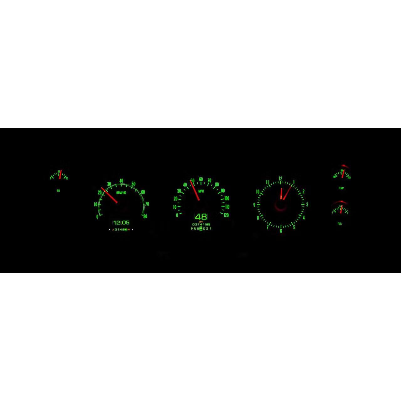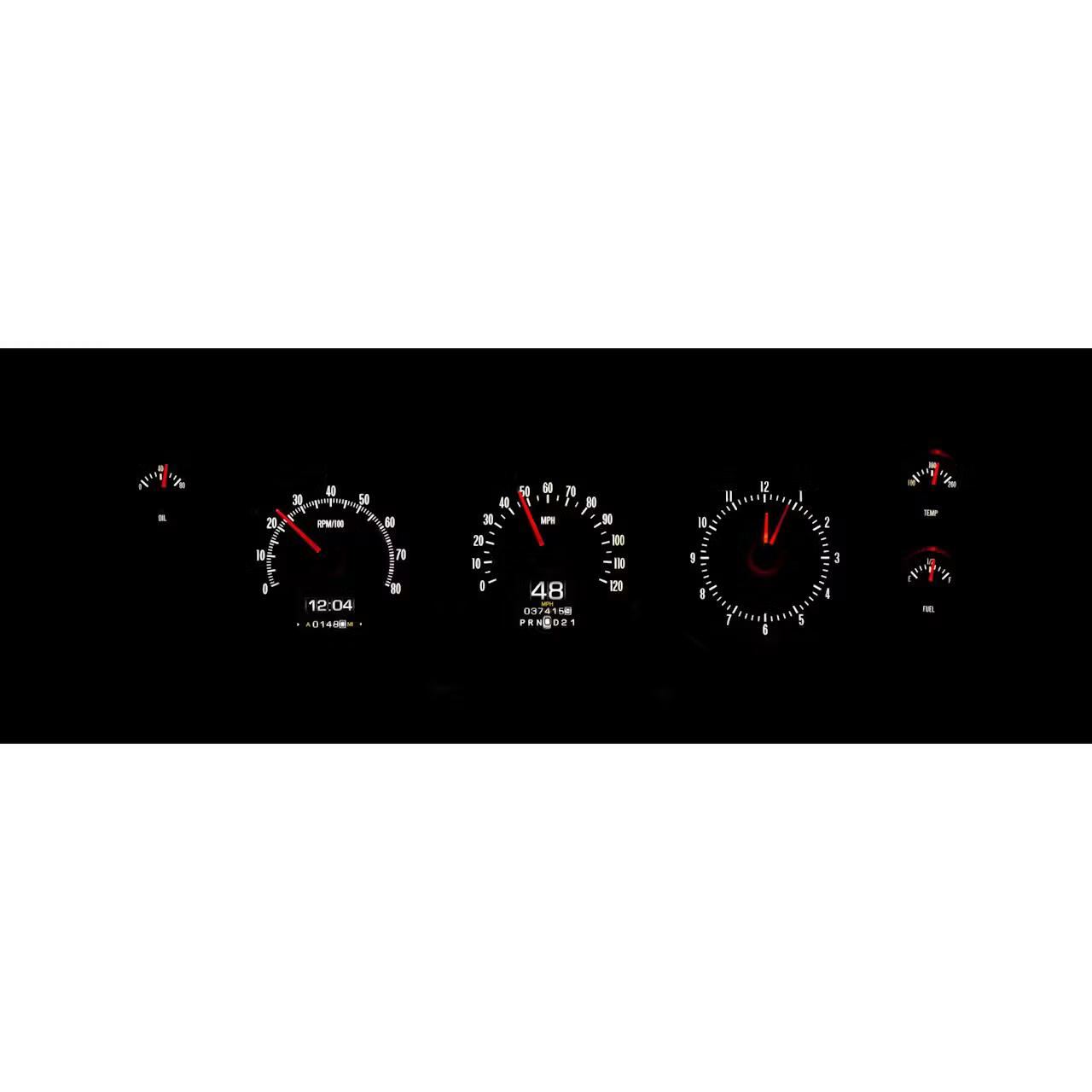 Each analog gauge sweep contains a red LED indicator for quick notice of a warning condition (except speedometer)