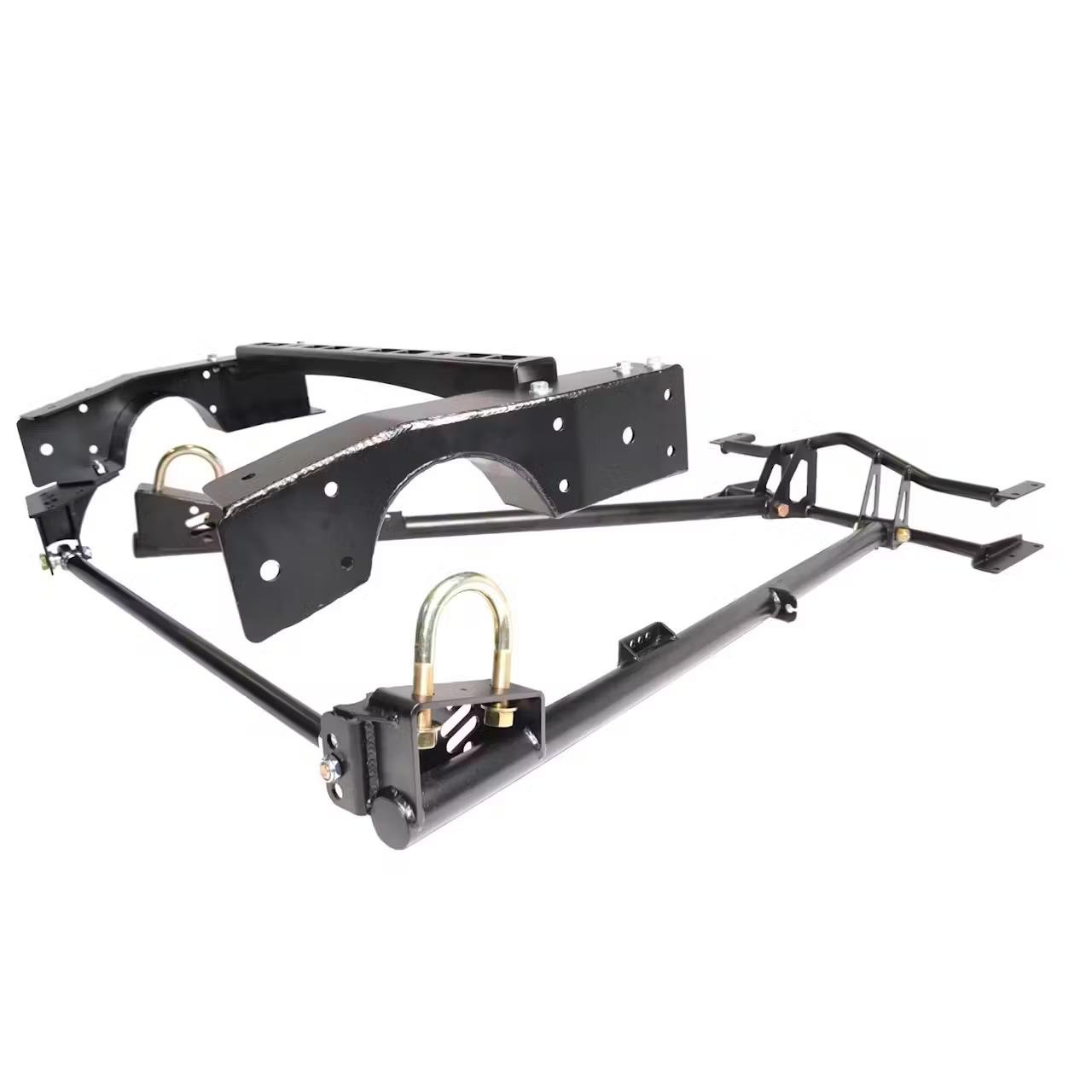 - Rear StrongArm System is completely bolt-on and provides mounting for the rear CoilOvers. The front trailing arm crossmember is designed to allow the exhaust to be run through it rather than under it providing additional ground clearance. The panhard is adjustable so you can optimize your tire clearance at the new lowered height and the mount has been relocated to optimize the bar length and angle for the lowered height. This helps keep the rear end centered in the truck and lowers the roll center to minimize body roll. We use R-Joints on both ends of the bar. The C-notches are included with the kit and FIT the frame rail. The trailing arms optimizes the driveline angles for the lowered stance and utilize R-Joint at the front attachment. Compatible with all bed and cab configurations (requires use of 1 piece drive shaft.) *Shim kit required for installation in wood bed applications.