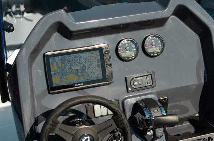 Deep V-shaped hull, 1 bow mooring cleat, 2 stern mooring cleats, 1 bow ring, central hold, 20 gal intergrated fuel tank with water/fuel separator, bow locker with separate compartments: anchor locker + removable storage bin, navigation lights, 2 aft lockers, removable bow storage box, fiberglass console with bolster seat, dual digital gauges, bilge pump, battery cut off, 2 paddles, foot pump, pressure gauge, repair kit, owner’s manual