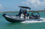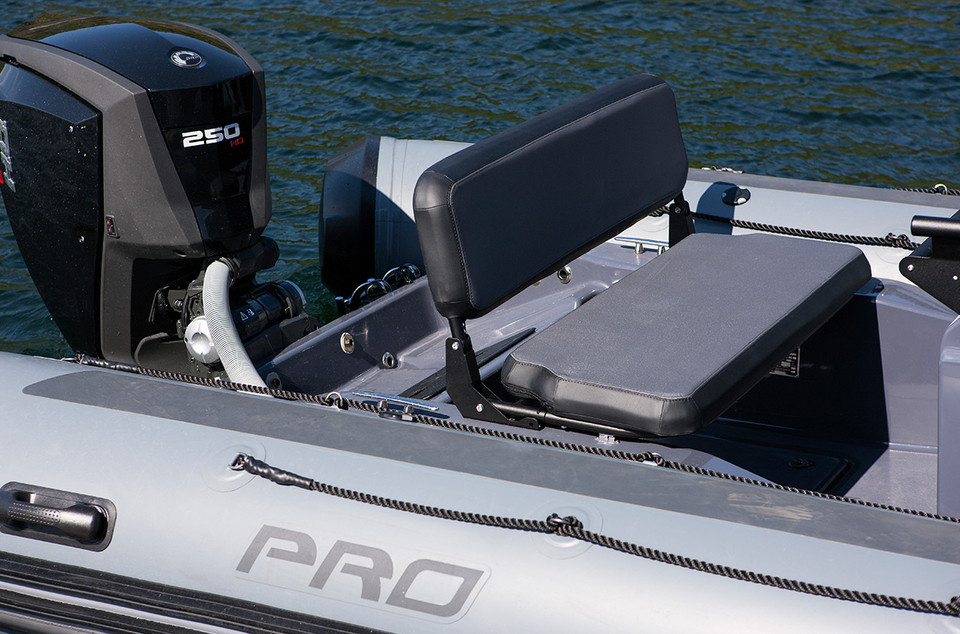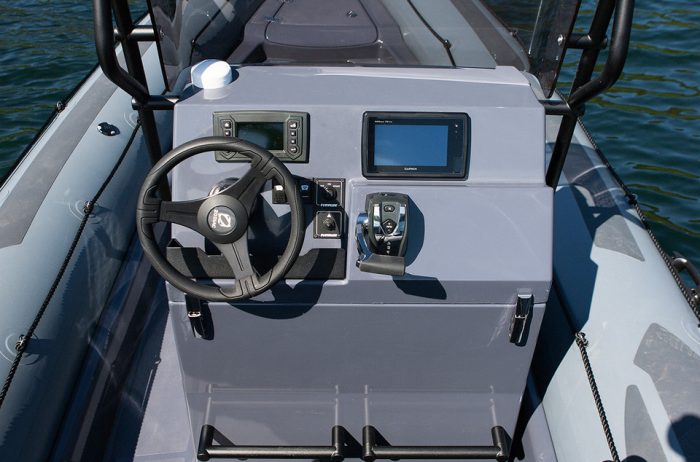 Deep V fiberglass hull, H-XLS console, Fiberglass bolster, Anchor locker can be padlocked, Stern flush deck locker, Front locker, 2 high volume bailers, Removable tubeset, Fiberglass bow step inc. anchor roller, Bumper Cones, Integrated fuel tank + water/fuel separator, Battery switch, Bilge pump, 2 paddles, Foot pump & pressure gauge, Repair kit, Owner’s manual